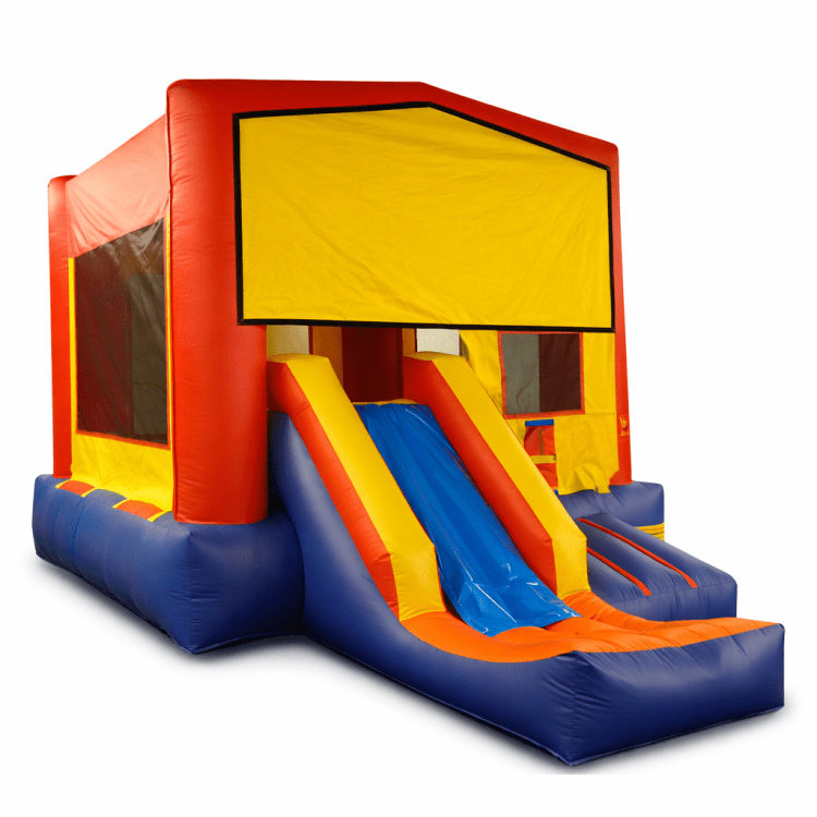 This Module Front Slide With Window bounce house for rent offers a inflatable slide, with the difference here is that the slide is mounted to the front of the bouncer to keep on eye to the kids. This amazing bounce house combo with slide have bright colors of red, yellow and blue. The bounce house portion features a peaked roof and mesh-covered windows, while the slide has high inflatable sides and a generous landing area.